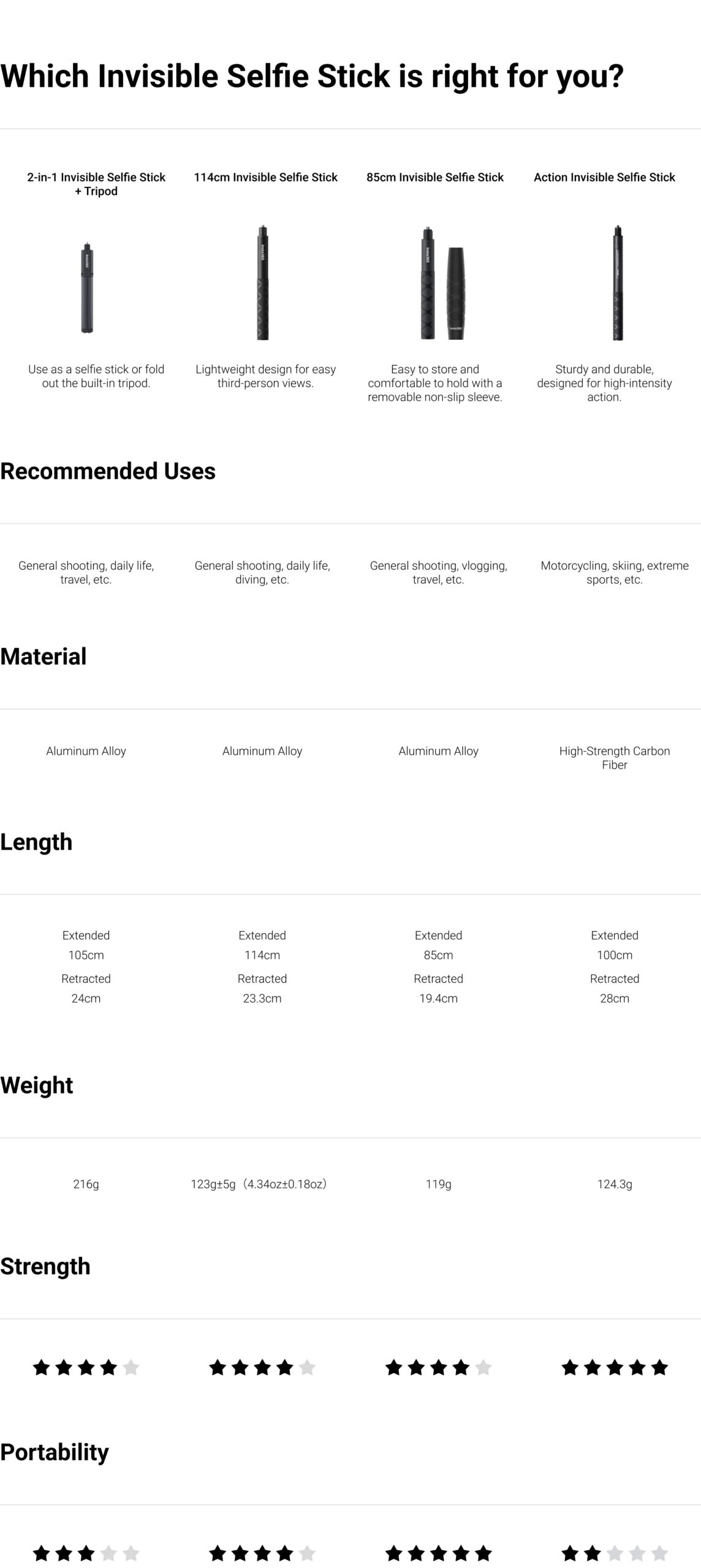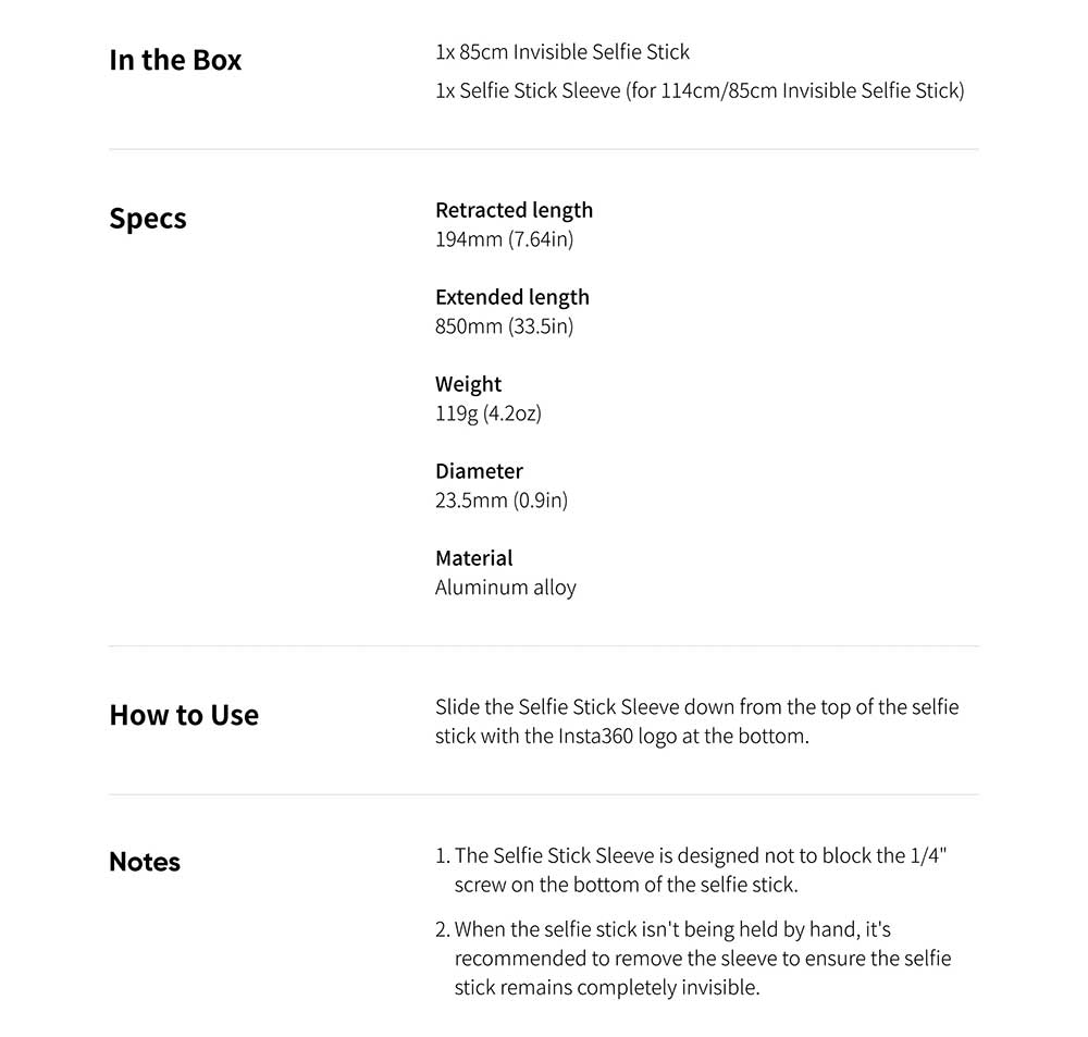 • A lightweight selfie stick perfect for capturing daily life, but not designed for high-speed adventures. For high-intensity sports and action, we recommend the Action Invisible Selfie Stick.
