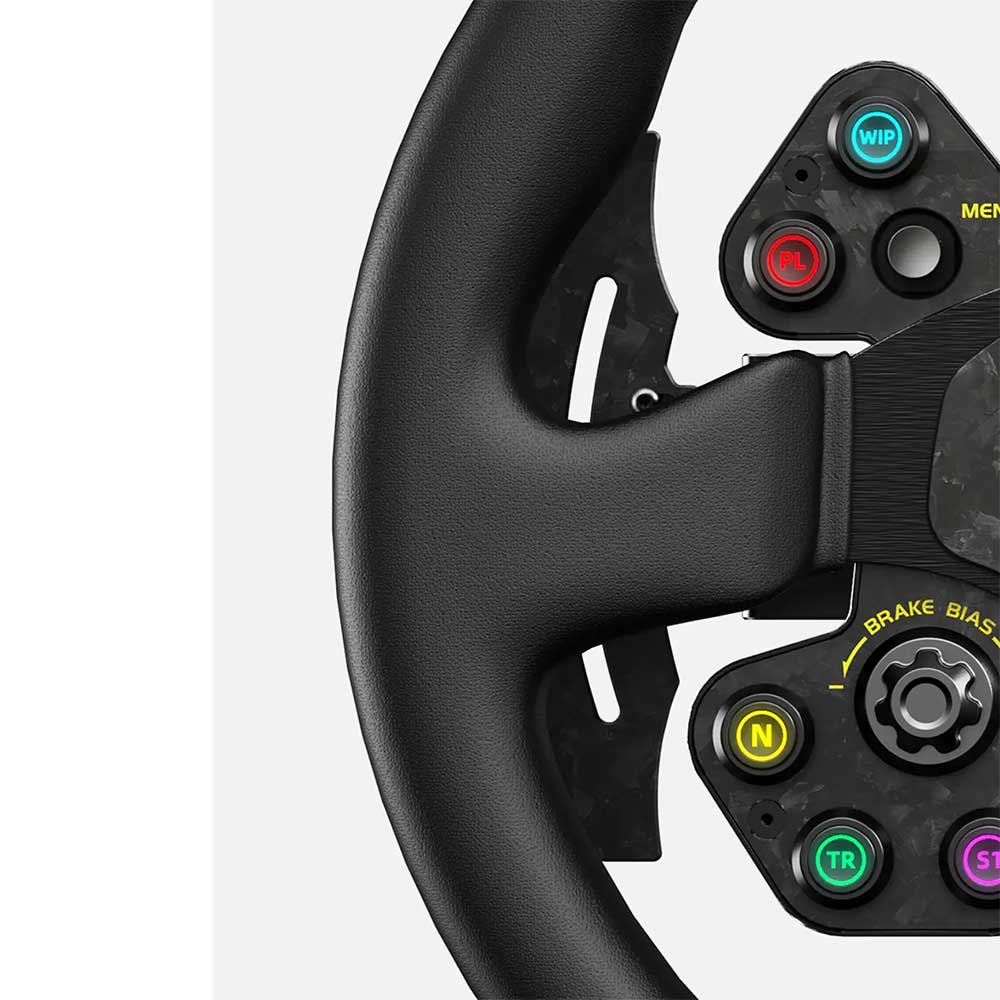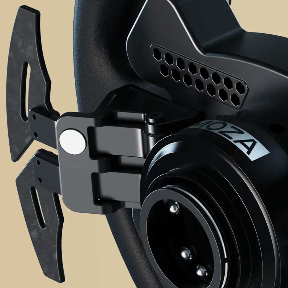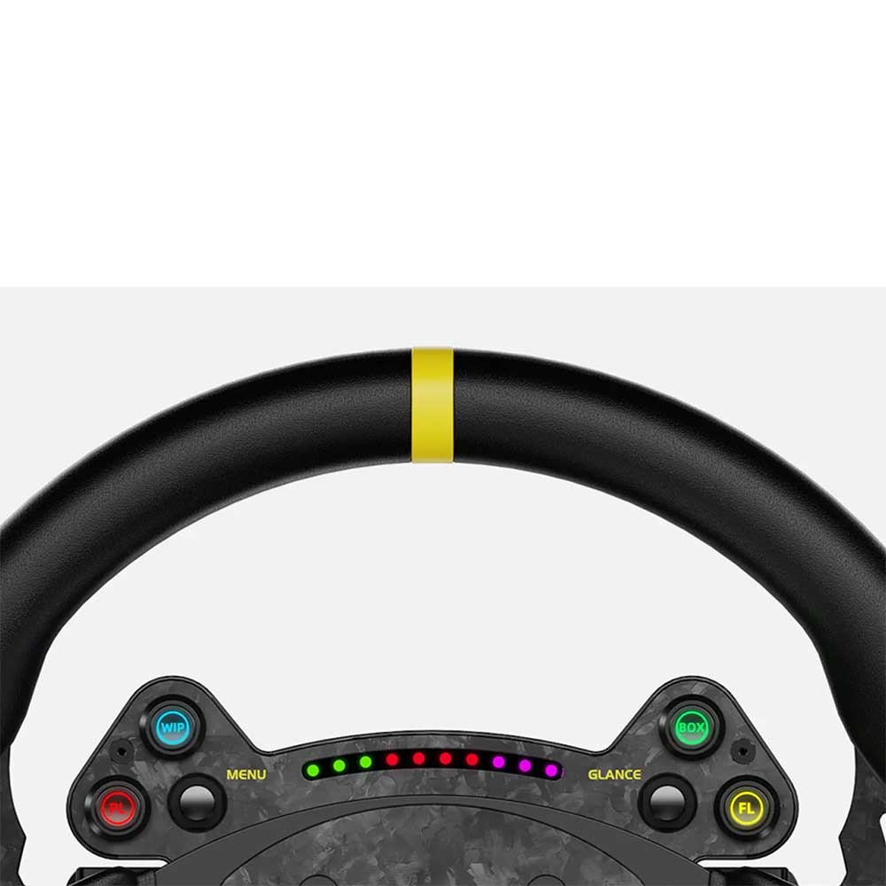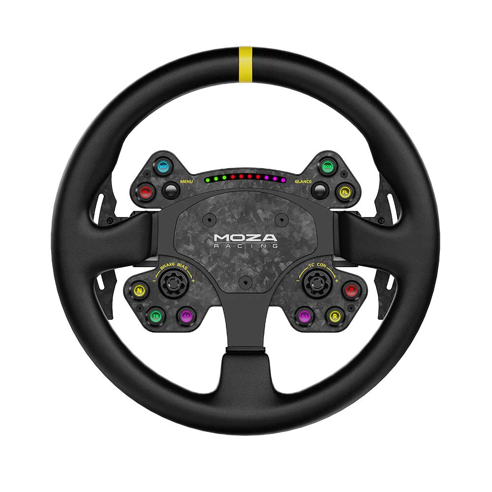 MOZA RS V2 Steering WheelUpgrade your sim racing setup with the RS sim racing steering wheel. This GT wheel offers compatibility with all MOZA wheelbases, seamlessly integrating for an optimized racing experience. Constructed using a combination of forged carbon fiber and aluminum, it ensures both resilience and elegance. Enjoy the 13-inch standard racing rim with an ergonomic design for utmost comfort during exhilarating races. Adorned with a genuine leather grip, it provides a stylish touch. Effortlessly install and remove it with the built-in quick-release mechanism. The LED RGB Rev Light heightens your racing immersion, while the carbon fiber magnetic shifters guarantee precise gear changes.