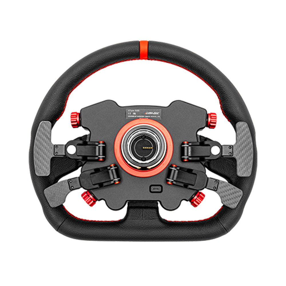 The Simagic GT1 steering wheel is ideal for GT and touring car simulations in sim racing. It offers a robust quick-release system and a characteristic round shape. The quick-release system enables seamless switching between real and simulated vehicles. With a diameter of 330 mm, high-quality coating and equipped with two shift paddles on the back